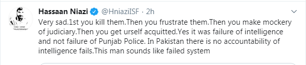 چاروں طرف سے وزیر اعلیٰ بزدار کو دیکھ کریہ لگتا ہے کہ پنجاب کے لوگوں کے پاس ان کی حفاظت کے لئے ریاست نہیں ہے۔تفصیلات کے مطابق آج سانحہ ساہیوال میں ملوث سی ٹی ڈی کے 6 اہلکاروں کو بھری کر دیا گیا ہے اور واقعہ کو حاڈچہ قرار دے دیا گیا ہے جس پر پورے پاکستان میں غم و غصے کی لہر پائی جارہی ہے، اایسے میں وزیر اعظم عمران خان کے بھانجے حسان خان نیازی بھی میدان میں آگئے اور بڑا پیغام جاری کر دیا ، سماجی رابطوں کی ویب سائٹ ٹوئٹر پر اپنے پیغام میں حسان نیازی کا کہنا تھا کہ ’’ ایک ہفتے میں صلاح الدین کیس اور ساہیوال کیس دونوں کوڑے دان میں پھینک دیئے جاتے ہیں،جب خود احتساب نہیں ہوگا تو پھر پاکستانی عوام کو نقصان اٹھانا پڑے گا۔ چاروں طرف سے وزیر اعلیٰ بزدار کو دیکھ کریہ لگتا ہے کہ پنجاب کے لوگوں کے پاس ان کی حفاظت کے لئے ریاست نہیں ہے‘‘۔ایک اور پیغام میں حسان نیازی کا کہنا تھا کہ ’’ بہت افسوس کے ساتھ کہنا پڑ رہا ہے کہ پہلے آپ ان کو مار ڈالیں،پھر آپ انہیں مایوس کریں ،پھر آپ عدلیہ کا مذاق اڑائیں گے اور پھر خود ہی ان کو بری کردیں ،یہ صرف آپ کی ذہانت کی ناکامی تھی نہ کہ پنجاب پولیس کی ناکامی،پاکستان میں انٹیلیجنس ناکامیوں کا کوئی احتساب نہیں ہے۔ یہ شخص ناکام نظام کی طرح لگتا ہے ‘‘۔