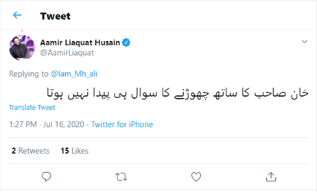 اس پیغام کے ردِ عمل میں ایک صارف کی جانب سے فیصلے پر غور اور وزیراعظم عمران خان کا ساتھ نہ چھوڑنے پر زور دیا گیا، جس پر عامر لیاقت نے جواب دیا کہ ’خان صاحب کا ساتھ چھوڑنے کا سوال ہی پیدا نہیں ہوتا‘۔خیال رہے کہ اس سے قبل بھی عامر لیاقت کے الیکٹرک پر برہمی اور اپنی جماعت میں اختلاف کا اظہار کرچکے تھے۔ ایک ٹوئٹ میں انہوں نے کہا تھا کہ میری جماعت مجھے کراچی کا نمائندہ نہیں گردانتی، کوئی بات نہیں ،عمران خان تب بھی میرا لیڈر ہے اور رہے گا البتہ کے الیکٹرک کے معاملے پر میں پہلی باراپنے کپتان سے ملتمس ہوں مجھے آن بورڈ لیا جائے اپنے پیغام میں عامر لیاقت نے یہ کہا کہ میں اعتراف کرتا ہوں کہ میں کراچی کا ایک بے بس رکن قومی اسمبلی ہوں اور اپنے شہر کے لوگوں کو بجلی فراہم کروانے سے قاصر ہوں۔
