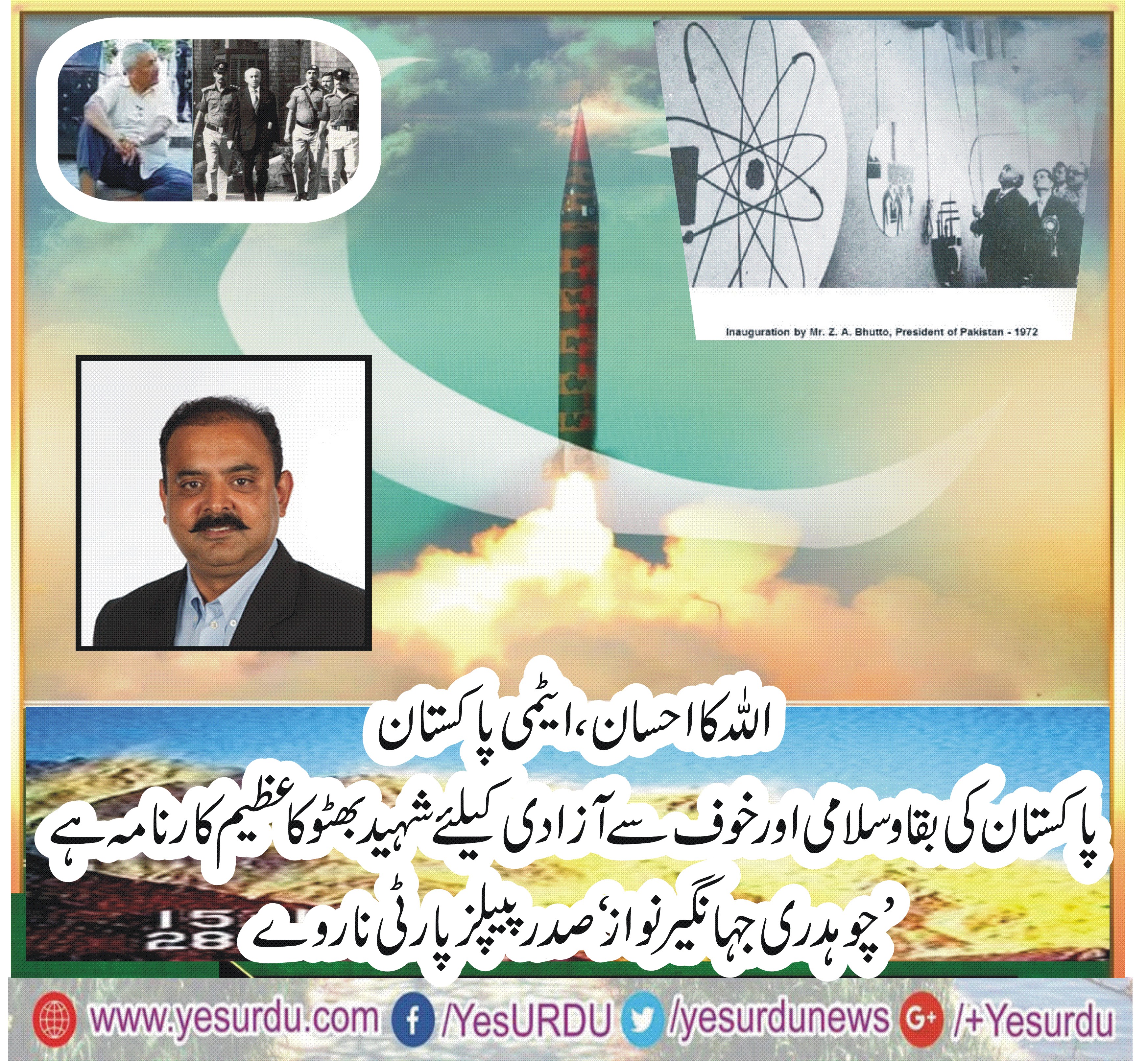 ایٹمی پاکستان اللہ تعالیٰ کا احسان اور پاکستان کی بقا وسلامی کیلئے شہید بھٹو کا عظیم کارنامہ ہے، چوہدری جہانگیر نواز