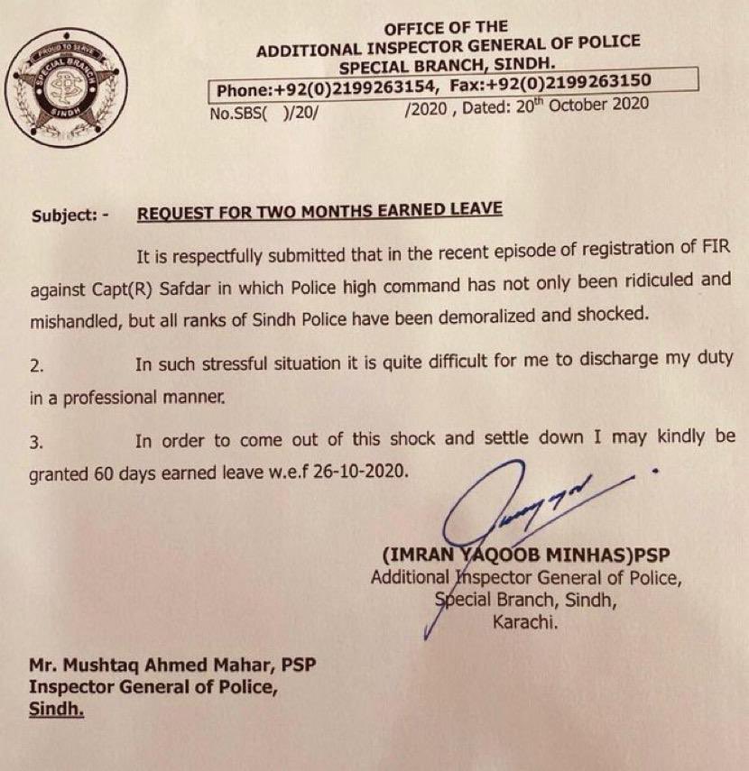سندھ پولیس کے ایڈیشنل انسپکٹر جنرل (اے آئی جی) اسپیشل برانچ عمران یعقوب منہاس نے کیپٹن (ر) صفدر کی گرفتاری کے معاملے میں بےجا مداخلت پر دو ماہ کی چھٹی کی درخواست دے دی۔