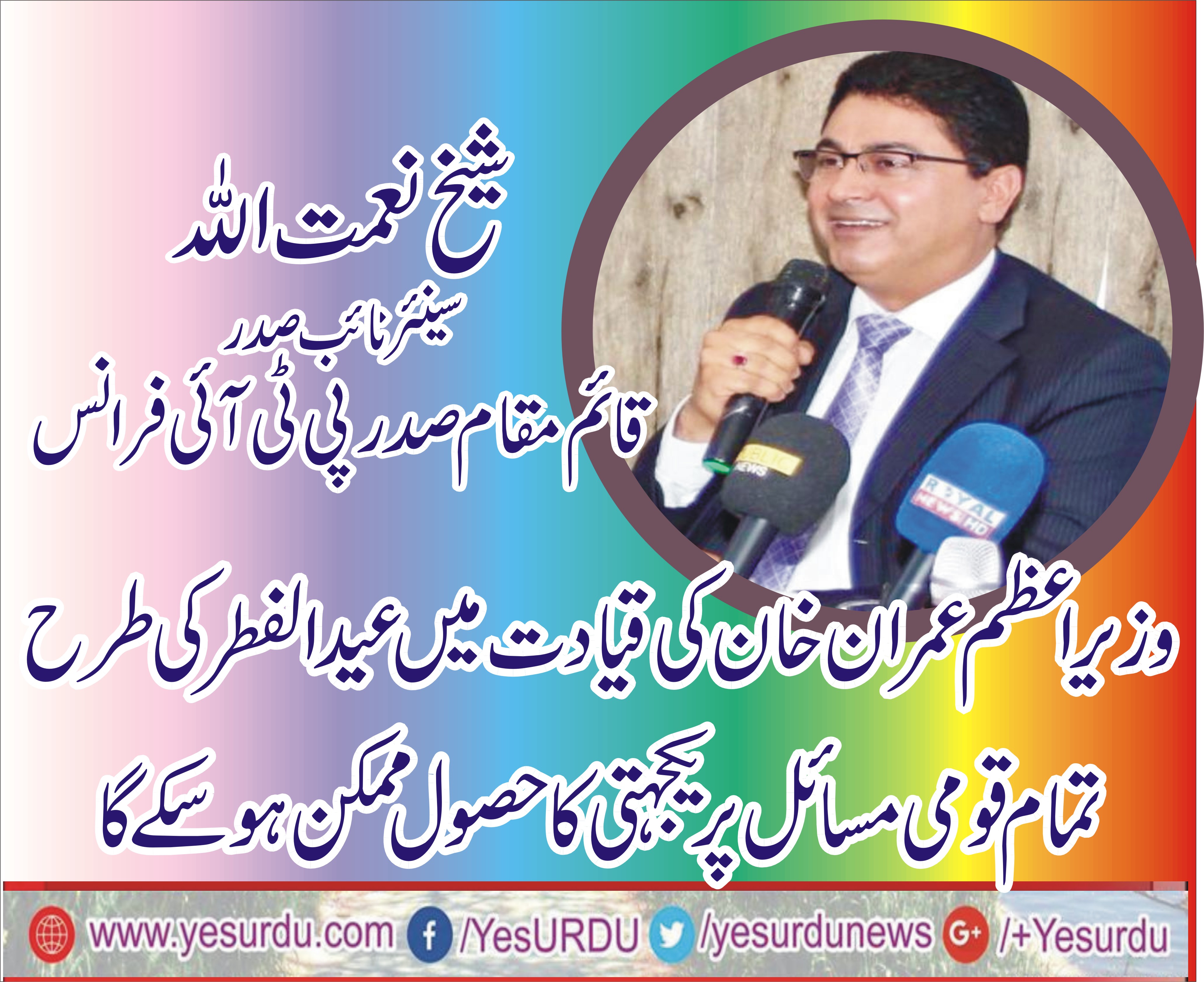 پیرس؍اسلام آباد(ایس ایم حسنین) پاکستان تحریک انصاف فرانس کے قائم مقام صدر شیخ نعمت اللہ نے کہا ہے کہ وزیراعظم عمران خان کی قیادت میں عید کی طرح تمام مسائل پر قومی یکجہتی کی منزل قریب آرہی ہے۔ ان کا کہناتھا کہ وزیراعظم کی مدبرانہ قیادت ہر طرح کے شک و شبہ سے بالا تر ہے اور ان سے بڑا محب وطن لیڈر آج تک اقتدار میں نہیں آیا جس نے دو ہی سال میں قومی اور عالمی سطح پر امت مسلمہ کی یکجہتی کی منزل کی طرف سفر شروع کردیا ہے۔