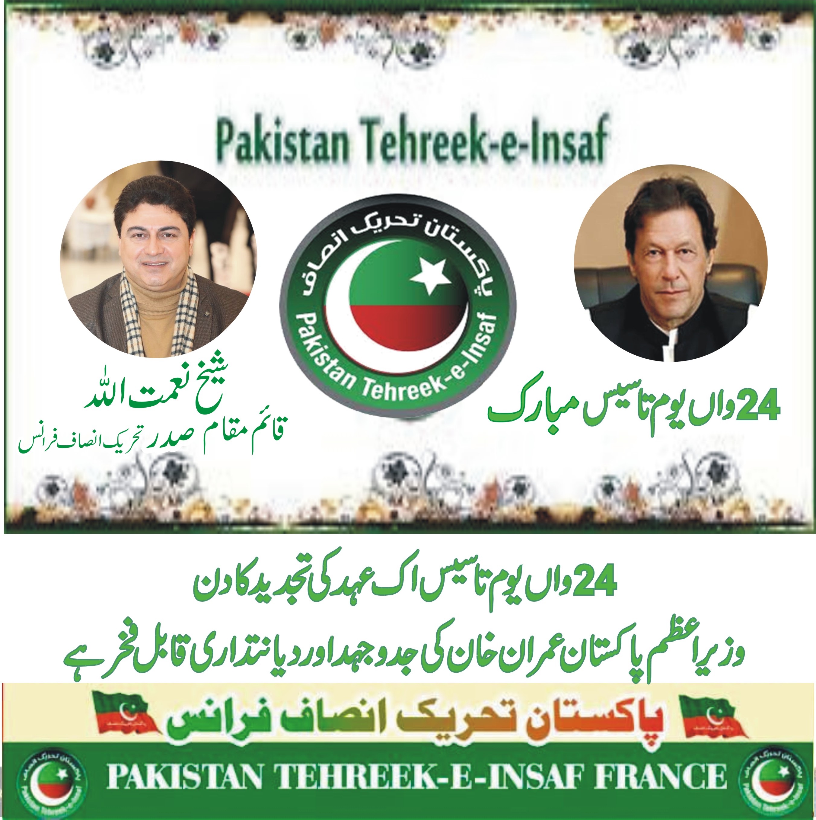 پاکستان تحریک انصاف کا 24واں یوم تاسیس، وزیراعظم کی ولولہ انگیز اوردیانتدار قیادت میں نئے عہد کی تجدید اورنئی منزلوں کی طرف گامزن قیادت اورکارکنوں کو دلی مبارکباد، شیخ نعمت اللہ