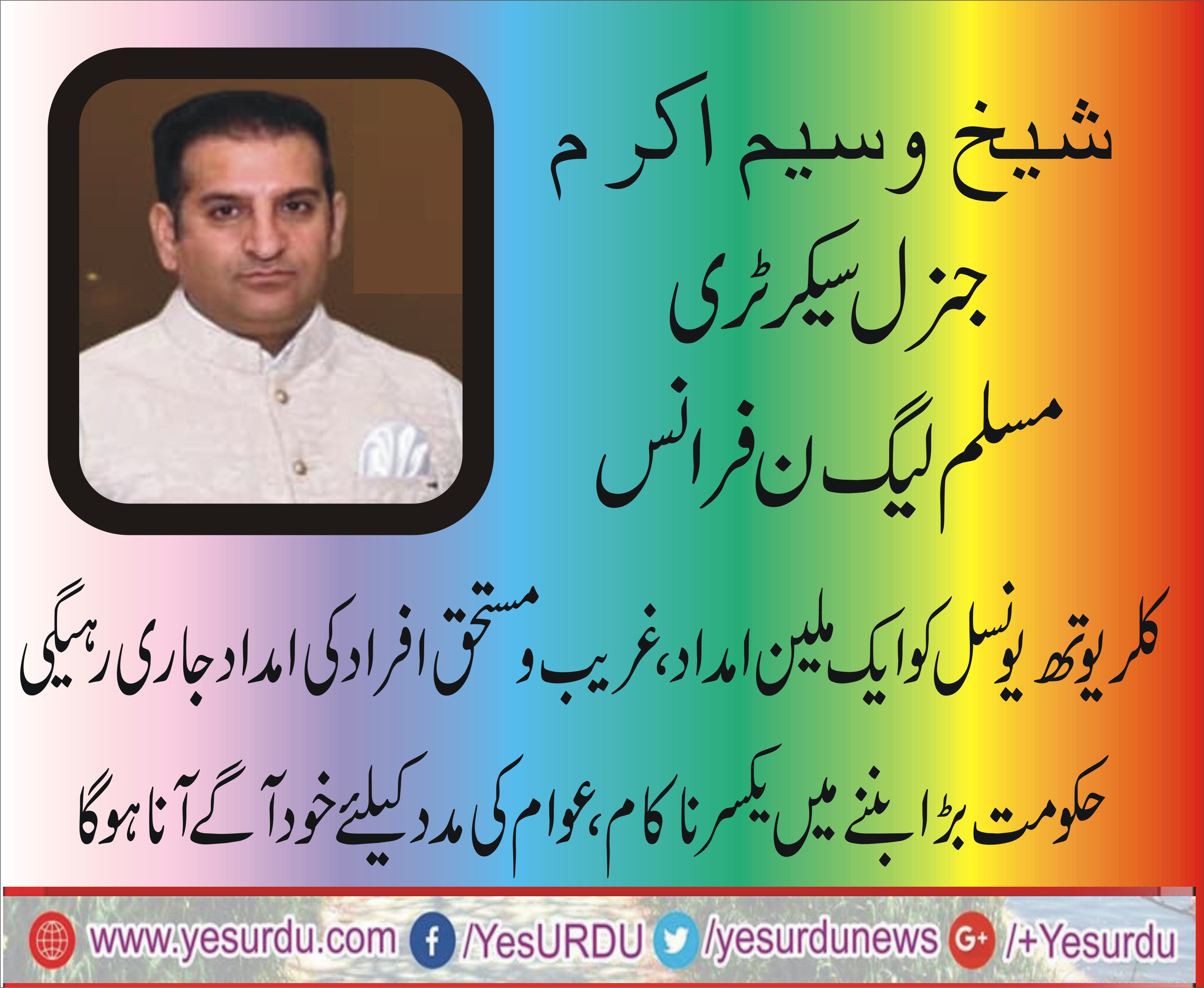 کلر یوتھ کونسل کو مزید امداد کی پیشکش، جنرل سیکرٹری مسلم لیگ ن فرانس شیخ وسیم اکرم کا حکومتی نااہلی کیخلاف عوام کی مدد کیلئے کمیونٹی ورک کو ترجیح بنانے کا فیصلہ