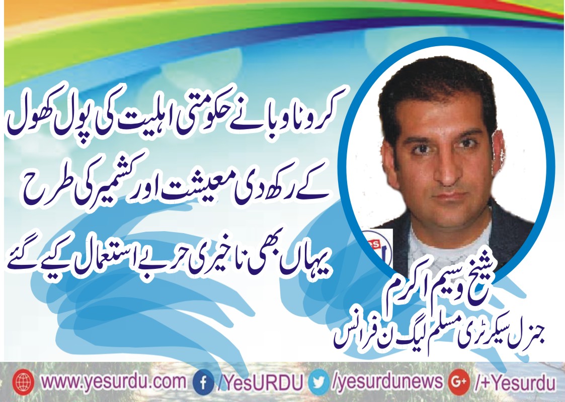 پیرس؍اسلام آباد(ایس ایم حسنین) پاکستان مسلم لیگ ن فرانس کے جنرل سیکرٹری شیخ وسیم اکرم نے کہا ہے کہ حکومت نے دو سال میں معیشت اورکشمیرکاذ کو ناقابل تلافی نقصان پہنچایا اور اب صحت عامہ کیلئے پیدا ہونے والے کرونا وبا کے مسئلے نے تو حکومتی صلاحیت کی پول کھول کر رکھ دی ہے۔