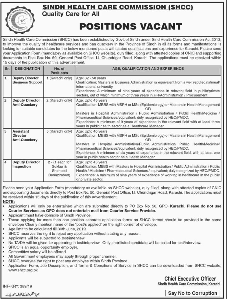 Sindh Health Care Commission (SHCC) Jobs 2019 for 10+ Admin / Management Posts28 January, 2019 Post Views - پوسٹ کو دیکھا گیا: 81