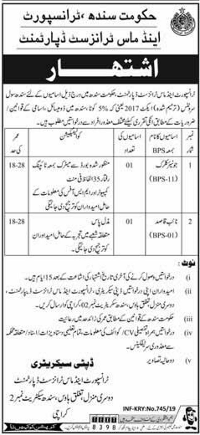 Sindh Transport & Mass Transit Department Jobs 2019 for Junior Clerk & Naib Qasid15 February, 2019 Post Views - پوسٹ کو دیکھا گیا: 134