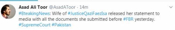 صحافی اسد علی طور نے سوشل میڈیا پر ایک فوٹو کاپی شیئرکرتے ہوئے لکھا کہ ” جسٹس قاضی فائزعیسیٰ کی اہلیہ نے تمام دستاویزات سمیت بیان میڈیا کو جاری کردیا جو گزشتہ روز انہوں نے ایف بی آر میں جمع کرایا تھا”۔