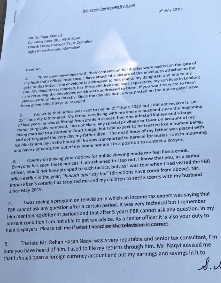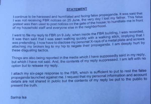 خاتون نے اپنے بیان میں لکھا کہ”میں بے بنیاد پراپیگنڈا اور ہراساں کیے جانے کا سامنا کررہی ہوں،یہ کہا گیا کہ میں 25 جون کو ایف بی آر کے نوٹسز وصول نہیں کررہی ، اسی روز میرے والد کا انتقال ہوا، پھر اس کو میرے پڑوسیوں اور گھر کے ملازمین کے سامنے تضحیک کے لیے ہمارے گھر کے گیٹ پر لگائے گئے نوٹسز میں بنیاد بنایاگیا۔