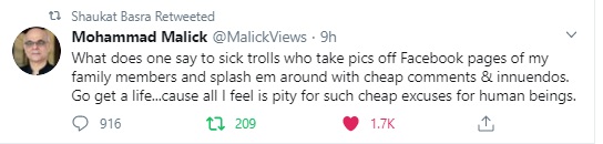 محمد مالک صاحب نے ان ٹوئٹس کے جواب میں ٹوئٹ کرتے ہوئے کہا کہ یہ ان کی فیملی کے ہمراہ تصاویر تھیں جو فیس بک سے لے کر گمراہ کن پروپیگنڈہ کیلئے استعمال کی گئی ہیں وہ ایسے لوگوں کے بارے میں اپنے دل میں افسوس کا جذبہ رکھتے ہیں جو لوگ بیمار ذہن کے ساتھ میری فیملی کی تصاویر گمراہ کن تبصروں کے ساتھ وائرل کر رہے ہیں۔