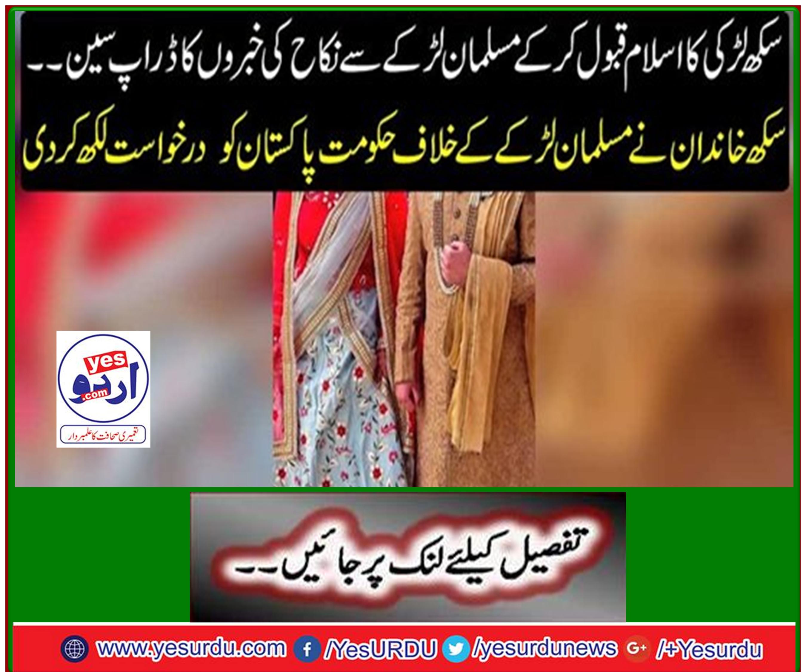 ننکانہ صاحب (ویب ڈیسک) سکھ لڑکی نے اسلام قبول کر کے مسلمان لڑکے سے نکاح کر لیا۔میڈیا رپورٹس میں بتایا گیا ہے کہ ننکانہ صاحب میں سکھ لڑکی نے اسلام قبول کر کے مسلمان نوجوان محمد حسان سے نکاح کر لیا ہے۔سکھ لڑکی جگجیت سنگھ کور دختر بھگوان سنگھ نے مقامی مدرسے میں جا کر اپنی مرضی سے