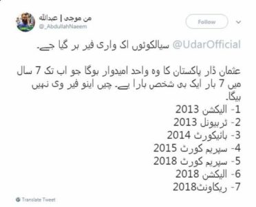 عبداللہ نعیم نے لکھا کہ عثمان ڈار سیالکوٹ سے ایک بار پھر ہار گیا ہے، عثمان ڈار پاکستان کا وہ واحد امیدوار ہوگا جو اب تک 7 سال میں 7 بار ایک ہی شخص سے ہاراہے لیکن اسے چین پھر بھی نہیں آرہا۔