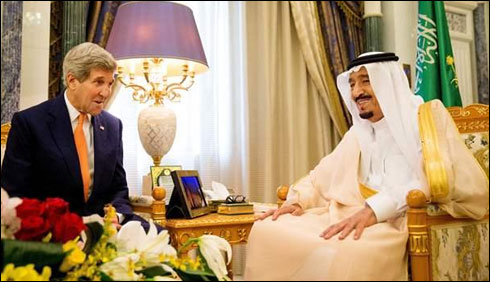 امریکی وزیر خارجہ جان کیری نے سعودی عرب کے شہر حفر الباطن میں سعودی فرماں روا شاہ سلمان سے ملاقات کی ۔ ملاقات میں شام اور یمن کے بحران سمیت سیکورٹی معاملات پر تبادلہ خیال کیا گیا ۔ جان کیری نے سعودی ولی عہد شہزادہ محمد بن نائف ، وزیردفاع محمد بن سلمان اور وزیرخارجہ عادل الجبیر سے بھی ملاقات کی ۔ امریکی حکام کے مطابق ملاقات میں جان کیری نے زور دیا کہ شام اور یمن کے بحران کو ختم کرکے آگے بڑھنے کی ضرورت ہے۔