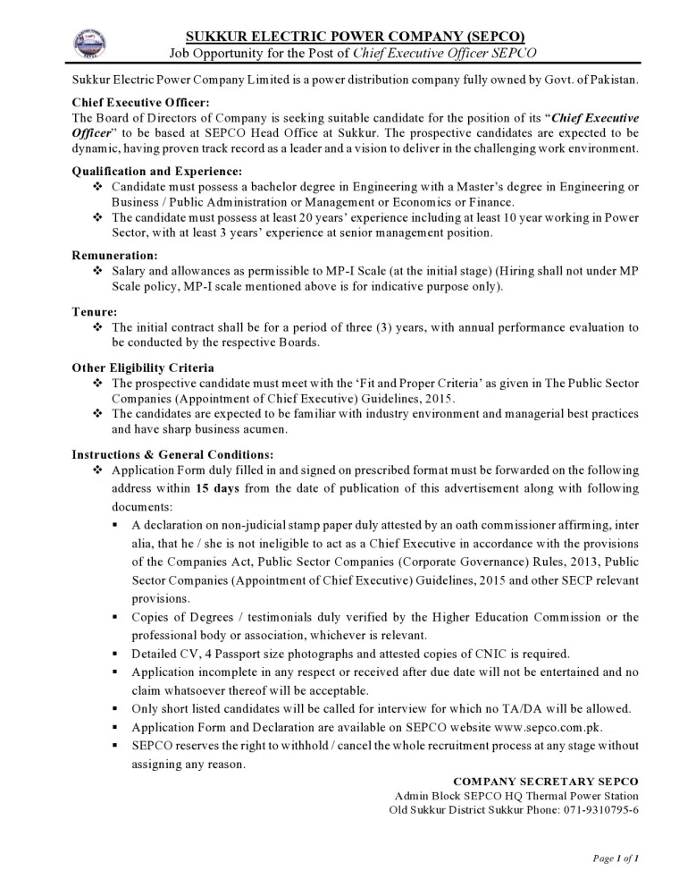 Sukkur Electric Power Company SEPCO, Government of Pakistan is inviting applications from energetic and committed candidates for the posts of CEO, Chief Executive Officer.