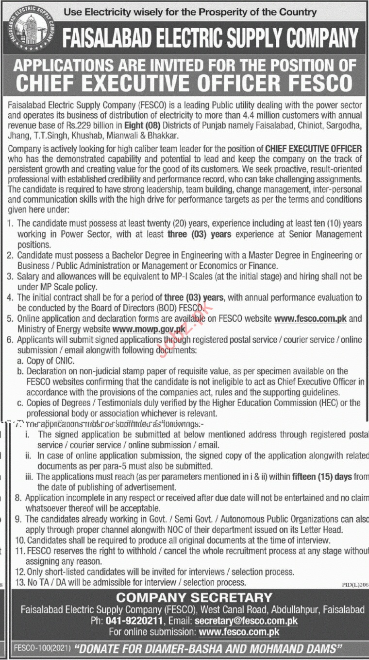 Faisalabad Electric Supply Company FESCO Jobs 2021 for CEO