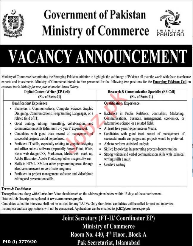 Ministry of Commerce Islamabad, Government of Pakistan is seeking for the services from experienced candidates for the posts of Digital Content Writer, Research Specialist, Communication Specialist.