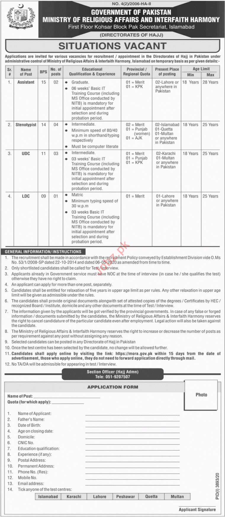 Ministry of Religious Affairs and Interfaith Harmony Islamabad, Government of Pakistan is seeking for the services from experienced candidates for the posts of Assistant, Stenotypist, UDC, LDC, Clerk.