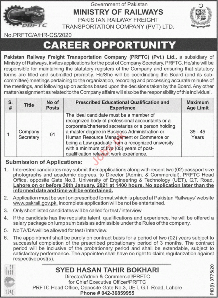 Pakistan Railway Freight Transportation Company PRFTC Lahore, Ministry of Railways, Government of Pakistan is seeking candidates for the posts of Company Secretary, Secretary.