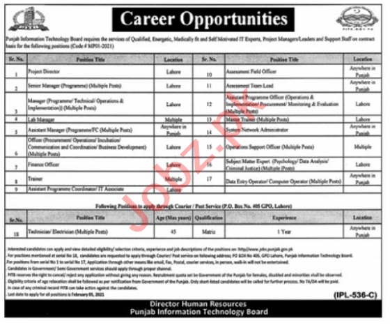 Punjab Information Technology Board PITB Lahore, Government of the Punjab is seeking candidates for the posts of Project Director, Manager, Senior Manager, Lab Manager, Assistant Manager, Program Officer, Finance Officer, Assistant Programmer, IT Assistant.