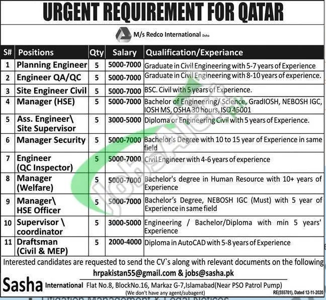Here on this page, you will get Qatar Jobs for Pakistani 2021 at Redco International Apply Online Free. Applications are recently offered from one of the well-known names in the list of international company named “Redco International” invites applications from the Pakistani well educated, calibre and adroit applicants are required to fill the following posts which are entitled as (Planning Engineer, Engineer QA/QC, Site Engineer Civil, Manager (HSE), Ass. Engineer / Site Supervisor, Manager Security, Engineer (QC Inspector), Manager (Welfare), Manager / HSE Officer, Supervisor / Coordinator, Draftsman (Civil & MEP)) are the current vacancies which need to be filled with the overall qualification of Bachelors / Intermediate / Relevant Diploma is required with 5 to 15 years experience in the relevant field is required and those having experience in the Middle East shall be preferred most. So, if you fulfill all these requirements and you have an interest in working abroad then this opportunity is just for you and apply as soon as possible as per the criteria are given below.