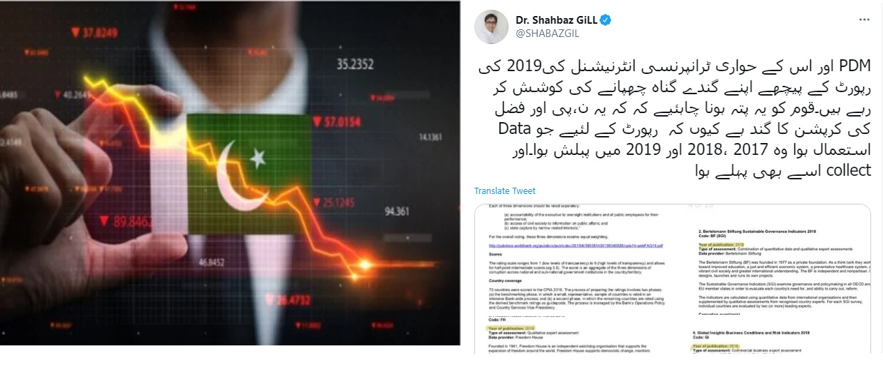 اپنی ایک ٹویٹ میں ان کا کہنا تھا کہ ’قوم کو یہ پتہ ہونا چاہیے کہ یہ مسلم لیگ ن، پیپلز پارٹی اور مولانا فضل الرحمن کی کرپشن کا گند ہے کیوں کہ رپورٹ کے لیے جو ڈیٹا استعمال ہوا وہ 2017 ،2018 اور 2019 میں پبلش ہوا اور اس سے بھی پہلے جمع کیا گیا۔‘