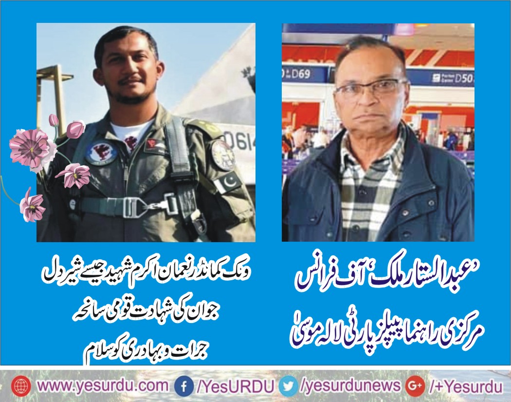 پیرس؍اسلام آباد(ایس ایم حسنین)پاکستان پیپلز پارٹی لالہ موسیٰ کے مرکزی راہنما عبدالستار ملک آف فرانس نے پاک فضائیہ کے ونگ کمانڈر شہید نعمان اکرم کو خراج عقیدت پیش کرتے ہوئے کہا ہے کہ پاک فضائیہ کے ہونہار آفیسر ونگ کمانڈر نعمان اکرم کی شہادت قومی سانحہ ہے اللہ تعالیٰ ان کی قربانی کے عوض انھیں دنیا وآخرت کے عظیم درجات سے فیضیاب کریں۔ ان کی شہادت اور ان کی جرات اوربہادری کو ہمیشہ یاد رکھا جائیگا۔ پاک فضائیہ کے شیردل پائلٹ اللہ تعالیٰ کا انعام اور قوم کا فخر تھے اللہ تعالیٰ ان کی قربانی کو قبول فرمائیں اور ان کوجواررحمت میں اعلیٰ مقام عطا فرمائیں۔ اوران کے اہلخانہ اور والدین کو صبرجمیل عطا فرمائیں اور ان کی جرات وبہادری سے جان کا نذرانہ پیش کرنے پر ان کے درجات بلند فرمائیں۔ آمین