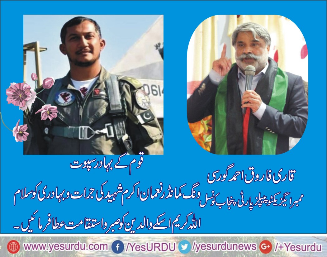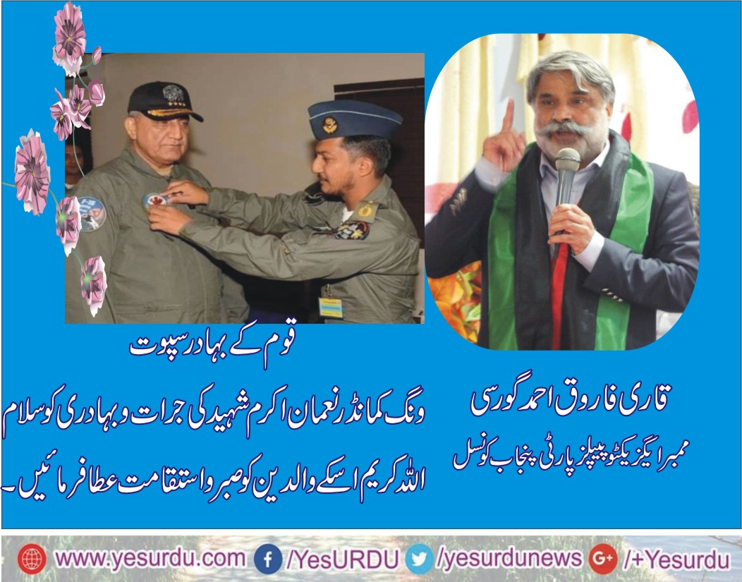پیرس؍اسلام آباد(ایس ایم حسنین)پاکستان پیپلز پارٹی پنجاب کونسل کے ممبرایگزیکٹو قاری فاروق احمد گورسی نے پاک فضائیہ کے ونگ کمانڈر شہید نعمان اکرم کی شہادت اور ان کی جرات اوربہادری سے جان کا نذرانہ پیش کرنے پر انھی خراج تحسین پیش کرتے ہوئے کہا ہے کہ غیرت مند قوم کے بہادر سپوت ایسے ہی ہوا کرتے ہیں ۔ ونگ کمانڈر نعمان اکرم شہید نے پوری قوم کی خاطر اپنی جان کی قربانی پیش کر کے لازوال کرداراداکیا۔