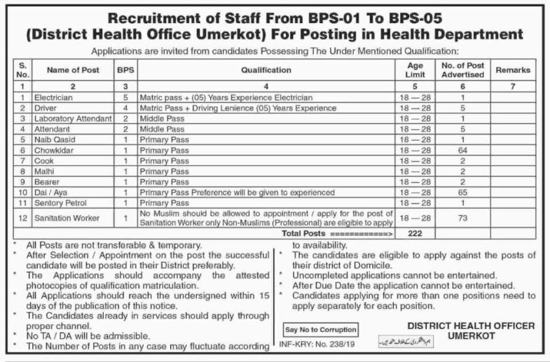 Umerkot District Health Office Jobs 2019 for 377+ Posts (BPS 1-15) in Multiple Categories18 January, 2019 Post Views - پوسٹ کو دیکھا گیا: 50