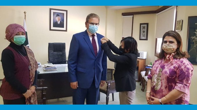 our Country and Deputy Country Representative called on @AmbassadorSadiq 🇵🇰 Special Representative for 🇦🇫 and presented @HeForShe lapel pin for championing gender equality and supporting the campaign.