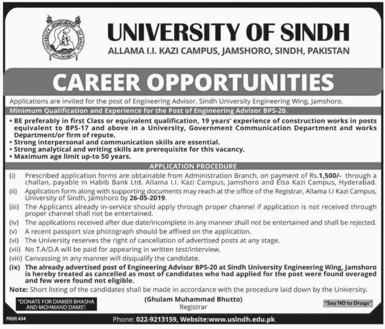 انجینئرنگ کے مشیر کے لئے سندھ یونیورسٹی کے روزگار 2019