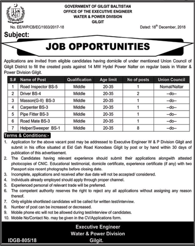 Water & Power Division Gilgit Jobs 2019 for 15+ Road Inspectors, Drivers, Skilled & Support Staff23 December, 2018 Post Views - پوسٹ کو دیکھا گیا: 67