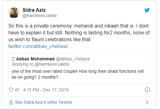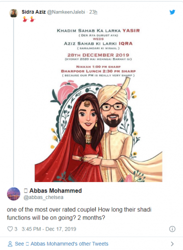 پر منظر عام پر آنے کے بعد عباس محمد نامی صارف نے سوال کر ہی ڈالا کہ اس سال کی سب سے ’اوور ریٹڈ‘ یعنی سب سے مقبول جوڑی کی شادی کتنی طویل ہوگی؟ کیا دو ماہ؟ صارف کے سوال کا جواب دینے اقرا عزیز کی بڑی بہن سدرہ عزیز میدان میں آگئیں اور کہا کہ ’سر! یہ ایک نجی تقریب ہے، صرف مہندی اور نکاح، مجھے اس سے زیادہ وضاحت دینے کی ضرورت نہیں ہے اور اس شادی کی تقریبات کوئی دو ماہ نہیں چلیں گی، ہم میں سے کوئی نمود و نمائش کی خواہش نہیں رکھتا۔‘ یہ بحث یہاں ختم نہیں ہوئی، سدرہ عزیز کی حمایت میں ایک خاتون صارف آگے آئیں اور کہا کہ ’آپ ایسے جل کر بول رہے ہیں جیسے آپ کی بہن کی شادی ہونی تھی یاسر سے جو نہیں ہوئی۔ عباس محمد نے جوابی ٹوئٹ میں لکھا کہ ’الحمد اللّہ میری دو بہنیں شادی شدہ ہیں اور اچھی جگہ پر ہیں، اگر میری بہن کی شادی یاسر جیسے شخص سے ہو رہی ہوتی تو میں اُس کی شادی روک دیتا۔‘ اقرا عزیز اور یاسر کی شادی کےحوالے سے سوشل میڈیا پر اٹھنے والی آگ کو ٹھنڈا کرنے کے لئے سدرہ عزیز کو ہی بیچ بچاؤ کرانا پڑا۔انہوں نے اس لڑائی کا اختتام یہ کہہ کر کر دیا کہ ’اللّہ آپ کی دونوں بہنوں کو خوش رکھے آمین۔‘سدرہ عزیز نے اپنے ایک اور ٹوئٹ میں لکھا کہ ’لوگوں کی خوشیوں میں خوش ہونا سیکھیں، اِس سے زندگی بہت ہی پُر مسرت گُزرتی ہے۔‘واضح رہے کہ اقرا عزیز اور یاسر حسین کی شادی رواں ماہ 28 دسمبر کو ہوگی، شادی کے کارڈ کی تصویر گزشتہ روز یاسر حسین اور اقرا عزیز نے اپنے اپنے انسٹاگرام اکاؤنٹ پر شیئر کی تھی۔