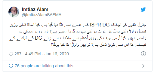 تبصرے میں کہا کہ میجر جنرل آصف غفور کو اچانک عہدے سے ہٹا دیا گیا ہے۔کیا اس کا تعلق وزیر فیصل واوڈا کی بوٹ کو عزت دو کی بیہودہ گردان سے ہے؟ اور وزیر معافی پہ راضی نہیں۔ کیا آرمی چیف کی وزیراعظم سے ملاقات سے پہلے ڈی جی کے تبادلے کے فیصلے کا اس سے کوئی تعلق ہے؟ تو پھر فیصل واوڈا کا کیا ہوگا؟