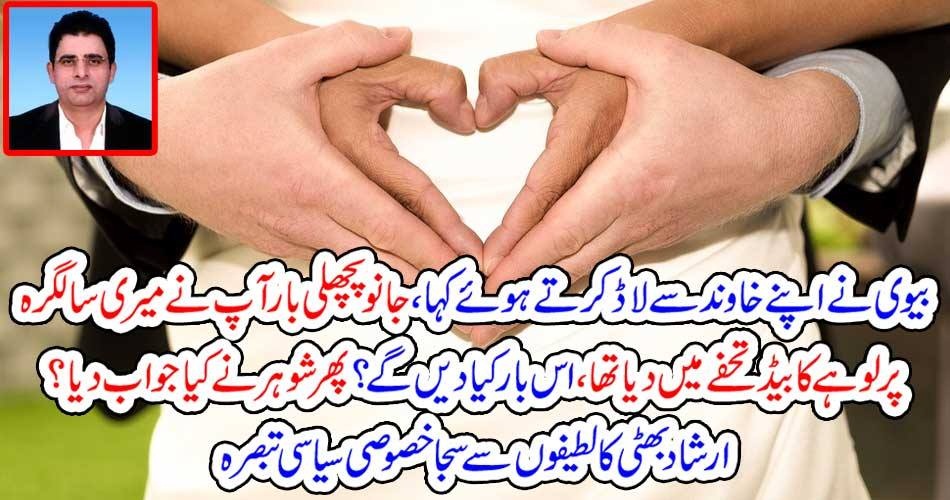 نامور کالم نگار ارشاد بھٹی اپنے ایک کالم میں لکھتے ہیں ۔۔۔۔۔۔ایک بیوی نے بڑے لاڈ بھرے انداز میں اپنے شوہر سے کہا ’’جانو شادی کی پچھلی سالگرہ پر تم نے مجھے میرا پسندیدہ لوہے کا بیڈ بنوا کر دیا، اس بار کیا دو گے۔شوہر بولا ’’جانو اس سال تحفتاً اس بیڈ میں کرنٹ چھوڑ نے کا ارادہ ہے‘‘، ایک سردار نے دوسرے سردار کا بچہ اغوا کیا اور ایک چٹ پر لکھا کہ میں نے تمہارا بچہ اغوا کر لیا،