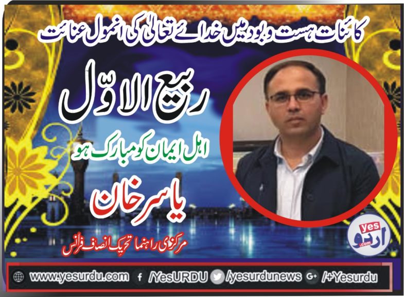 ربیع الاول کی مبارک ساعتوں کے آغاز پر تحریک انصاف کے مرکزی راہنما یاسر خان کا تمام اہل اسلام، عزیزواقارب اوردوستوں کیلئے مبارکباد اور نیک تمنائوں کا پیغام