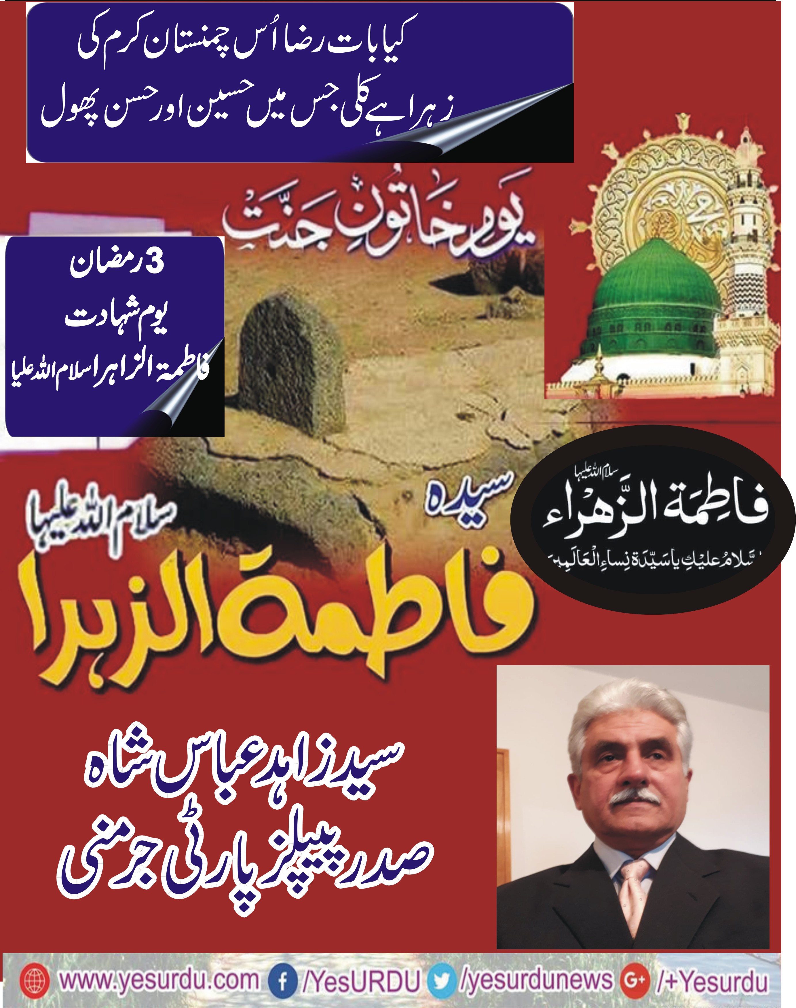 عظمت کاپیکر خاتون جنت سیدہ فاطمۃ الزاہرا سلام اللہ علیہا کی ذات پر کروڑوں سلام ۔ اللہ تعالیٰ پاک بی بی سلام اللہ علیہا کے صدقے تمام مومنین مومنات کو وبائی بحران میں اپنے حفظ و امان میں رکھیں۔