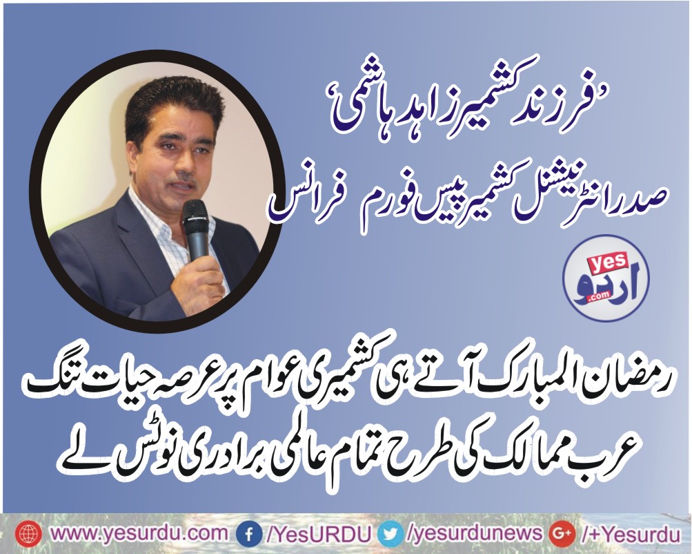 رمضان المباک آتے ہی مقبوضہ کشمیر میں قابض بھارتی فوج کے ظلم وستم میں اضافہ پرعالمی برادری نوٹس لے، فرزند کشمیر زاہد ہاشمی
