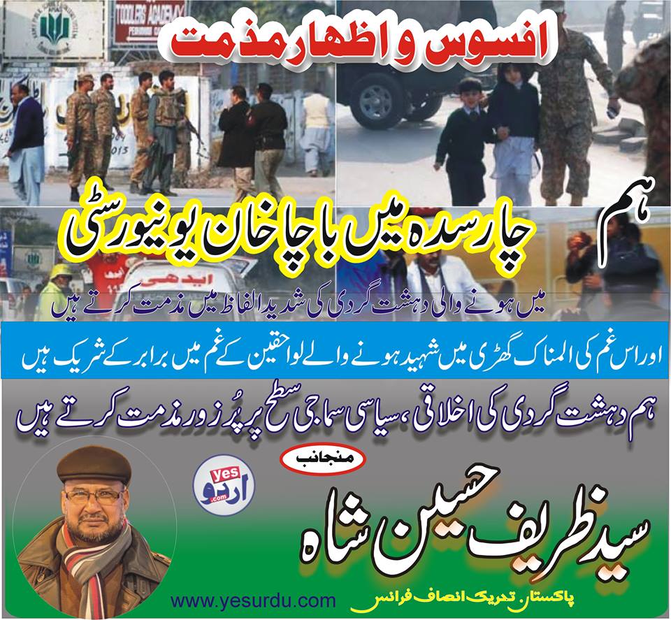سید ظریف حسین شاہ صاحب کی طرف سے چارسدہ میں باچا خان یونیورسٹی پر حملے کی شدید مذمت کا اشتہارسید ظریف حسین شاہ صاحب Post Views - پوسٹ کو دیکھا گیا: 170